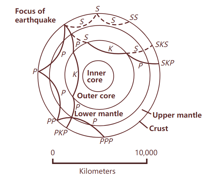 The layering of Earth has been inferred indirectly using the time of travel of refracted and reflected seismic waves created by earthquakes. The core does not allow shear waves to pass through it, while the speed of travel (seismic velocity) is different in other layers. The changes in seismic velocity between different layers causes refraction owing to Snell's law, like light bending as it passes through a prism. Likewise, reflections are caused by a large increase in seismic velocity and are similar to light reflecting from a mirror.