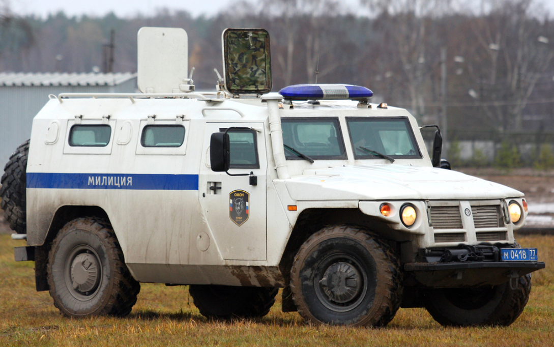 Специальная полицейская машина СПМ-1 (Special police car SPM-1) GAZ-233034 Tigr is used by the Russian Interior Ministry OMON in counter-terrorism operations and territorial defense. It is armoured, with IEC 50963-96 Class 3 side/rear protection and Class 5 frontal protection (GOST P 50963-96, level 1 corresponds to the STANAG 4569). The vehicle has accommodations for seven occupants including the driver. Early models permit the firing of personal weapons through one-way portholes in the body. In later models personal weapons can be fired through portholes in the armored glass. An automatic gun carriage can be fitted to the roof, along with radio signal jamming equipment.