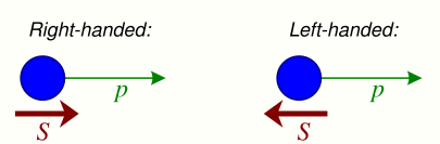 The helicity of a particle is positive (“right-handed”) if the direction of its spin is the same as the direction of its motion. It is negative (“left-handed”) if the directions of spin and motion are opposite. So a standard clock, with its spin vector defined by the rotation of its hands, has left-handed helicity if tossed with its face directed forwards.