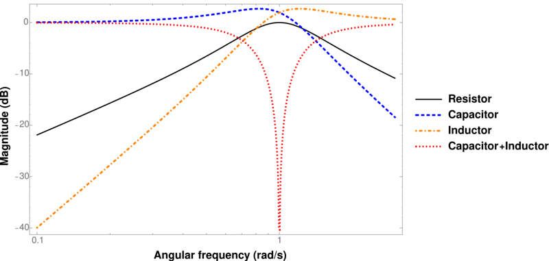 Rather than look for resonance, i.e., peaks of the gain, notice that the gain goes to zero at ω = ω0, which complements our analysis of the resistor's voltage. This is called antiresonance, which has the opposite effect of resonance. Rather than result in outputs that are disproportionately large at this frequency, this circuit with this choice of output has no response at all at this frequency. The frequency that is filtered out corresponds exactly to the zeroes of the transfer function, which were shown in Equation (7) and were on the imaginary axis.