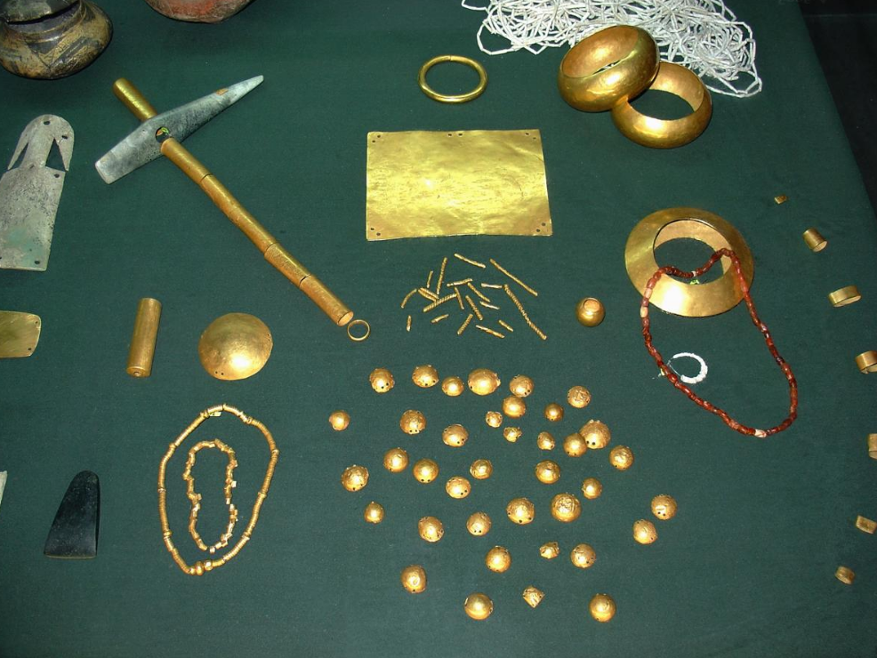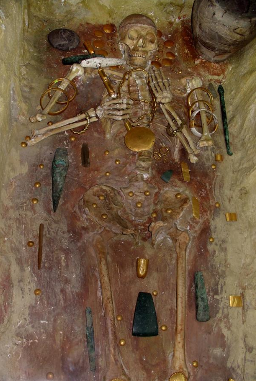 There are crouched and straight inhumations. Some graves do not contain a skeleton, but grave gifts (cenotaphs). These symbolic (empty) graves are the richest in gold artifacts. Three thousand gold artifacts were found, with a weight of approximately six kilograms. Grave 43 contained more gold than has been found in the entire rest of the world for that epoch. Three symbolic graves contained masks of unbaked clay.