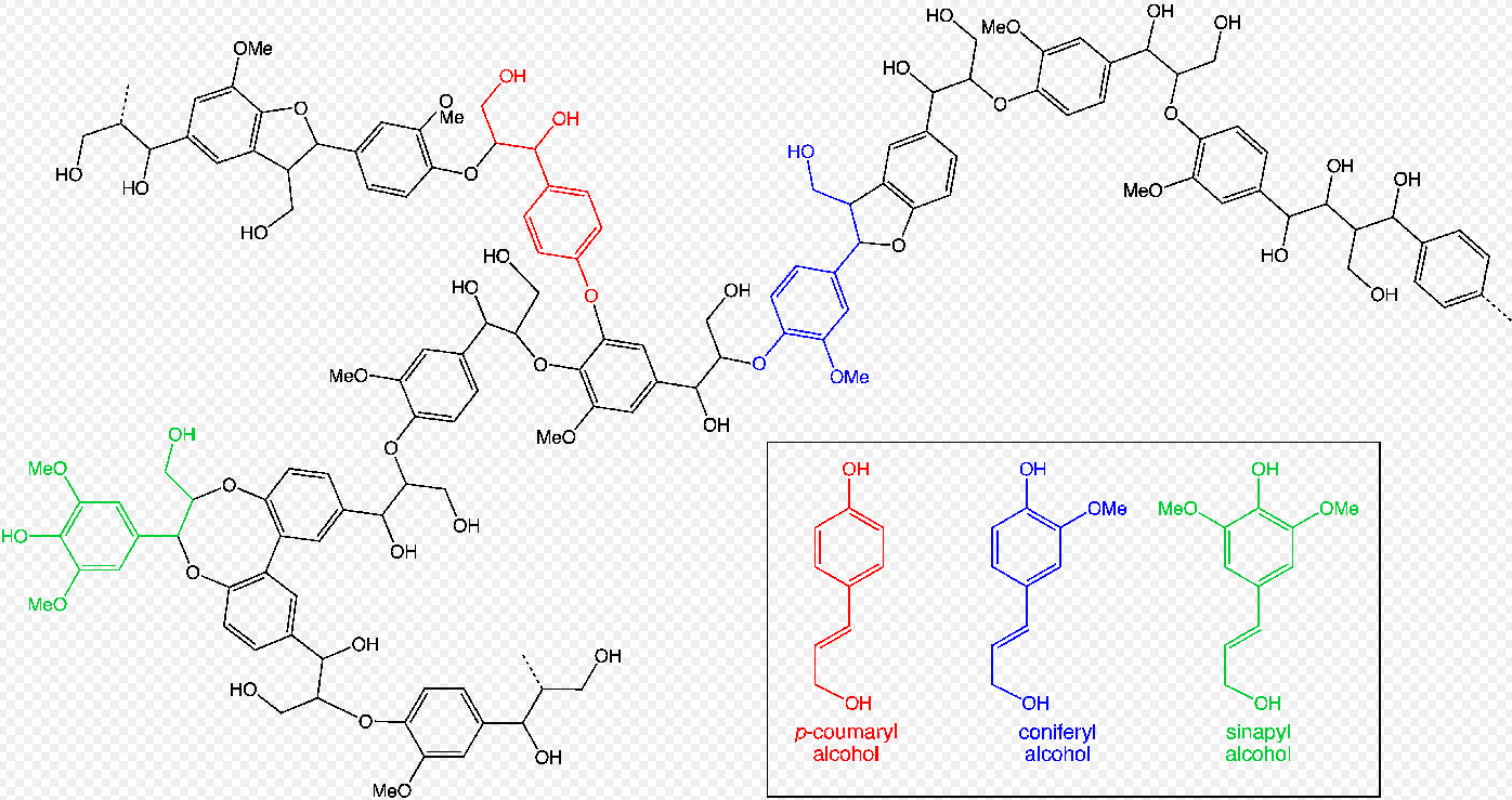 A Ligninin plant cell is a complex amorphous polymer and it is biosynthesized from three aromatic alcohols, namely P-Coumaryl, Coniferyl, and Sinapyl alcohols. Lignin is a highly branched polymer and accounts for 15-30% by weight of lignocellulosic biomass (LCBM), so the structure of lignin will vary significantly according to the type of LCBM and the composition will depend on the degradation process.[6] This biosynthesis process is mainly consists of radical coupling reactions and it generates a particular lignin polymer in each plant species. So due to having a complex structure, various molecular spectroscopic methods have been applied to resolve the aromatic units and different interunit linkages in lignin from distinct plant species.[7]