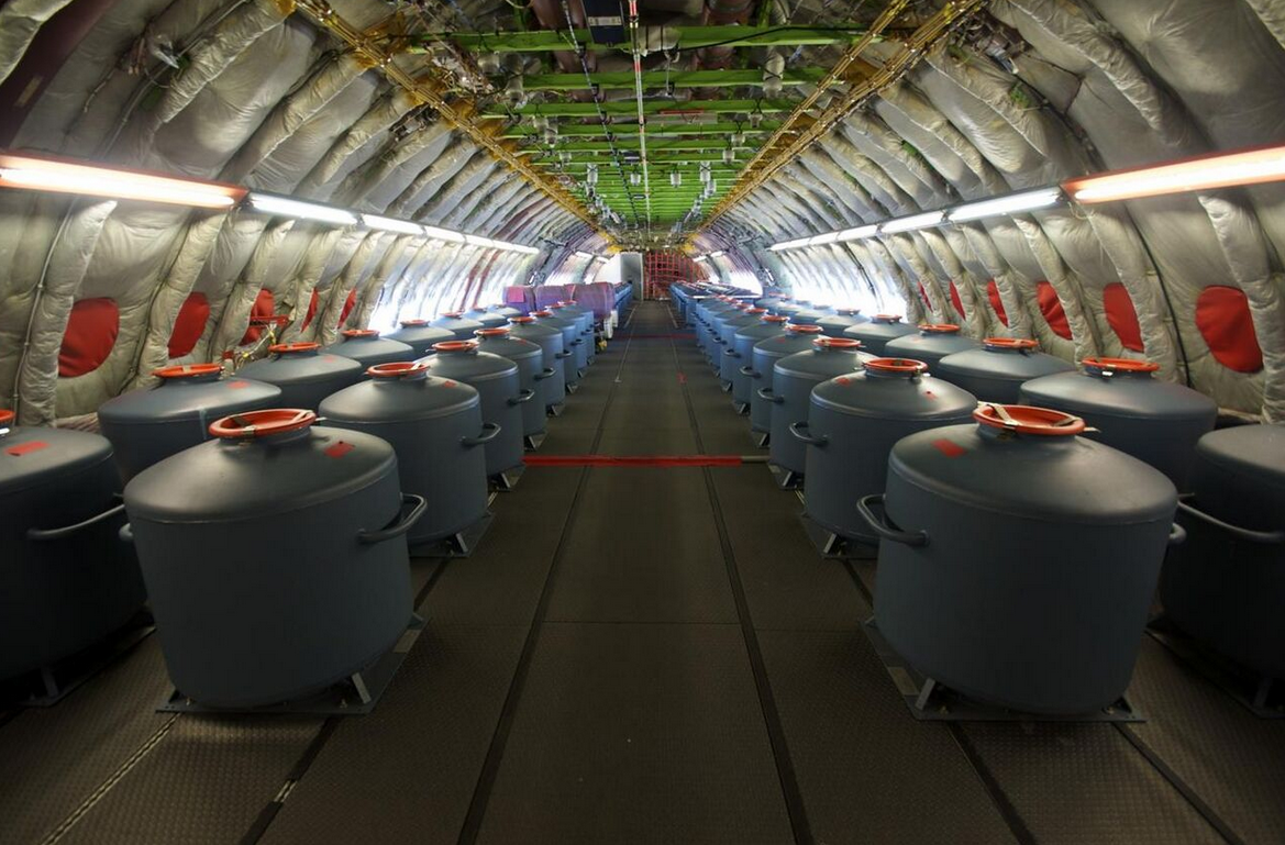 Photographs of barrels installed in the passenger space of an aircraft for flight test purposes have been claimed to show aerosol dispersion systems. The real purpose of the barrels is to simulate the weight of passengers or cargo. The barrels are filled with water, and the water can be pumped from barrel to barrel in order to test different centers of gravity while the aircraft is in flight.[19]