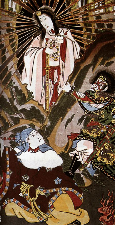 In general, some of these Amaterasu-dragon associations have been in reference to Japanese plays. One example has been within the Chikubushima tradition in which the dragon goddess, Benzaiten was the emanation of Amaterasu.[16] Following that, in the Japanese epic, Taiheki, one of the characters, Nitta Yoshisada (新田義貞), made comparisons with Amaterasu and a dragon with the quote: “I have heard that the Sun Goddess of Ise … conceals her true being in the august image of Vairocana, and that she has appeared in this world in the guise of a dragon god of the blue ocean.”[16]