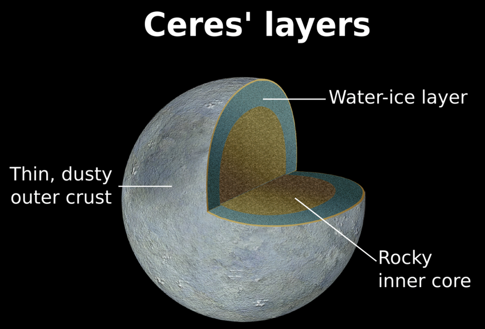Ceres appears to be differentiated into a rocky core and icy mantle and may harbour a liquid-water ocean under its surface.[12][13]