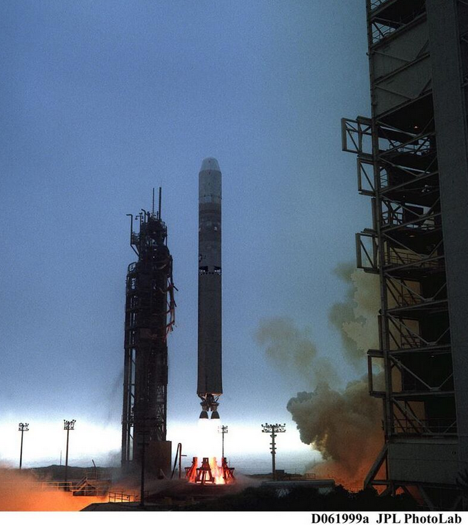 The newly constructed satellite was set to launch on a Titan II rocket from Vandenberg Air Force Base in California. The rocket lifted off at 7:15 pm PDT on 19 June 1999. Roughly two minutes and thirty seconds after launch, the first engine was shut down and the second was engaged as it moved over the Baja California Peninsula. A minute later, the nose cone, at the top of the rocket, separated into two parts. Sixteen seconds later, the rocket was re-oriented to protect the satellite from the sun. For the next 48 minutes, the two crafts flew over Antarctica and later over Madagascar, where the rocket reached its desired altitude of 500 mi (800 km).[9]