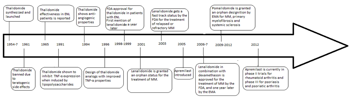 The development of analogs of thalidomide was precipitated by the discovery of the anti-angiogenic and anti-inflammatory properties of the drug yielding a new way of fighting cancer as well as some inflammatory diseases after it had been banned in 1961. The problems with thalidomide included; teratogenic side effects, high incidence of other adverse reactions, poor solubility in water and poor absorption from the intestines. In 1998 thalidomide was approved by the U.S. Food and Drug Administration (FDA) for use in newly diagnosed multiple myeloma (MM) under strict regulations. This has led to the development of a number of analogs with fewer side effects and increased potency which include lenalidomide, pomalidomide and apremilast, all of which are currently marketed and manufactured by Celgene.