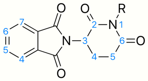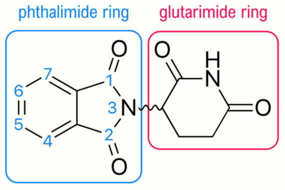 The thalidomide molecule is a synthetic derivative of glutamic acid and consists of a glutarimide ring and a phthaloyl ring (Figure 5).[20][41] Its IUPAC name is 2-(2,6-dioxopiperidin-3-yl)isoindole-1,3-dione and it has one chiral center[20] After thalidomide's selective inhibition of TNF-α had been reported, a renewed effort was put in thalidomide's clinical development. The clinical development led to the discovery of new analogs which strived to have improved activities and decreased side effects.[6][42]