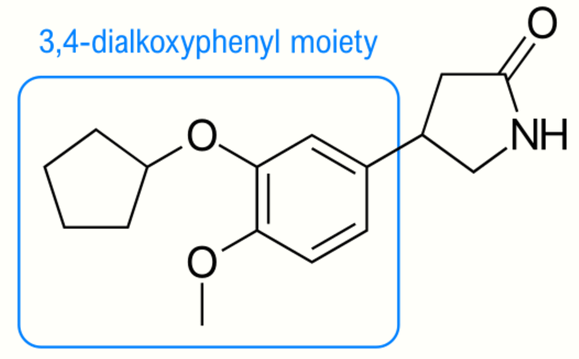 After finding a novel set of analogs of thalidomide, namely 3-(1,3-dioxo-1,3 dihydroisoindol-2-yl)-3-(3,4-dimethoxyphenyl) propionic acid (not shown), which had PDE4 inhibition activity the work began to optimize the activity. For that purpose the researchers used a known structure moiety, 3,4-dialkoxyphenyl, that is a recognized pharmacophore in PDE4 inhibitors such as rolipram (Figure 6) and roflumilast and added it onto the structure of the previously mentioned analog series. After tweaking the structure and testing different substitution at the 4-position of the phthaloyl ring and at the carboxyl acid the researchers finally landed at a molecule that potently inhibits PDE4 and TNF-α, which they later named apremilast (Figure 4). The S-enantiomer of apremilast was chosen since it was the more active enantiomer.[20] Since the structure of apremilast lacks the acidic chiral hydrogen it should not racemize in vivo, unlike thalidomide, lenalidomide and pomalidomide.[41][42]
