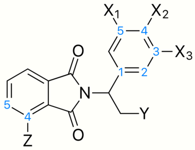 Substitutions on the phthaloyl ring have been explored and it was noticed that nitro groups at the C4 or C5 location decreased activity but C4 or C5 amino substitution increased it dramatically.[41] When the substitution at the 4 (Z) location on the phthaloyl ring was examined, hydroxyl and methoxy groups seem to make the analog a less potent PDE4 inhibitor. An increase in activity was observed with amino and dimethylamino to a similar extent but a methyl group improved the activity further than the aforementioned groups. A 4-N-acetylamino group had slightly lower PDE4 inhibitory activity, compared with the methyl group, but increased the compound's TNF-α inhibitory activity to a further extent.[20] Substituents at Z leading to increasing PDE4 inhibitory activity thus followed the order: