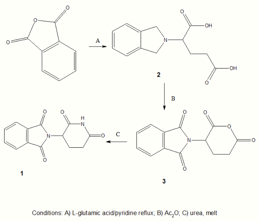 Synthesis of thalidomide has usually been performed as seen in scheme 1. This synthesis is a reasonably simplistic three step process. The downside of this process however is that the last step requires a high-temperature melt reaction which demands multiple recrystallizations and is not compliant with standard equipment.