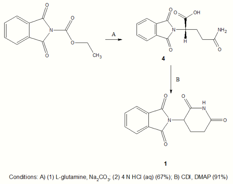 Scheme 2 is the newer synthesis route which was designed to make the reaction more direct and to produce better yields. This route uses L-glutamine rather than L-glutamic acid as a starting material and by letting it react with N-carbethoxyphthalimide gives N-phthaloyl-L-glutamine (4), with 50–70% yield. The substance 4 is then stirred in a mixture with carbonyldiimidazole (CDI) with enough 4-dimethylaminopyridine (DMAP) in tetrahydrofuran (THF) to catalyze the reaction and heated to reflux for 15–18 hours. During the reflux thalidomide crystallizes out of the mixture. The final step gives 85–93% yield of thalidomide, bringing the total yield to 43–63%.[48]