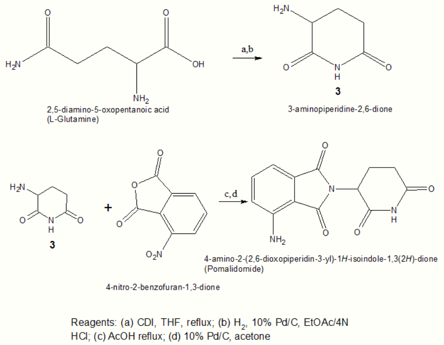 Both of the amino analogs are prepared from the condensation of 3-aminopiperidine-2,6-dione hydrochloride (Compound 3) which is synthesized in a two step reaction from commercially available Cbz-L-glutamine. The Cbz-L-glutamine is treated with CDI in refluxing THF to yield Cbz-aminoglutarimide. To remove the Cbz protecting group hydrogenolysis, under 50–60 psi of hydrogen with 10% Pd/C mixed with ethyl acetate and HCl, was performed. The formulated hydrochloride (Compound 3 in Scheme 3) was then reacted with 3-nitrophthalic anhydride in refluxing acetic acid to yield the 4-nitro substituted thalidomide analog and the nitro group then reduced with hydrogenation to give pomalidomide.[46]