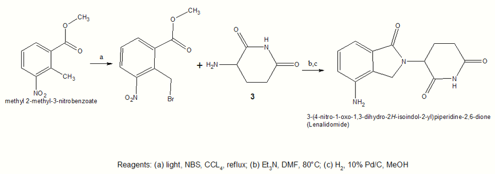 Lenalidomide is synthesized in a similar way using compound 3 (3-aminopiperidine-2,6-dione) treated with a nitro-substituted methyl 2-(bromomethyl) benzoate, and hydrogenation of the nitro group.[46]