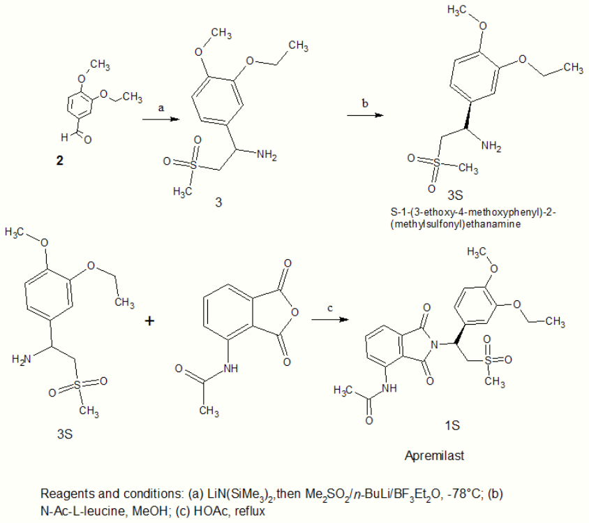 In the synthesis of apremilast, compound 3 in scheme 5 is produced in a 41% yield from compound 2 treated with lithium hexamethyldisilazide, in mixture with lithium dimethylsulfone and boron trifluoride etherate. The resolution of compound 3 was accomplished by treating it with N-acetyl-L-leucine yielding 3S. The final step then uses condensation of 3-N-acetylaminophthalic anhydride with 3S to afford apremilast (1S) in 75% yield.[20]