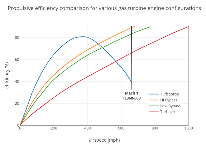 To get thrust, an aircraft engine is either a shaft engine – piston engine or turboprop, with its efficiency inversely proportional to its brake-specific fuel consumption – coupled with a propeller having its own propulsive efficiency; or a jet engine with its efficiency given by its airspeed divided by the thrust-specific fuel consumption and the specific energy of the fuel.[11]