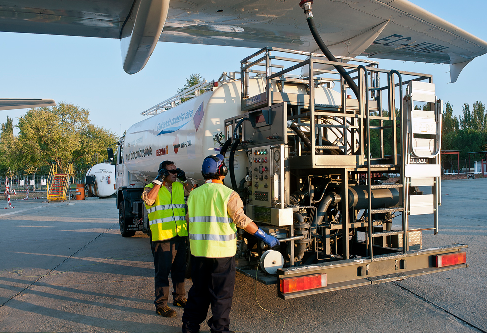 The aviation fuel density used is 6.7 lb/USgal or 0.8 kg/l.