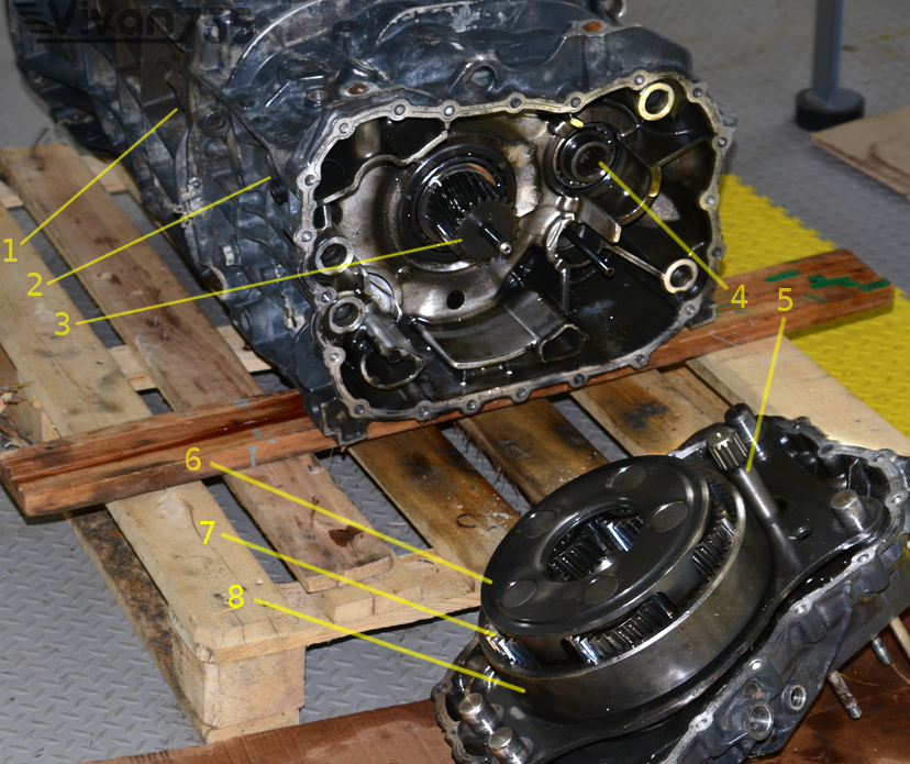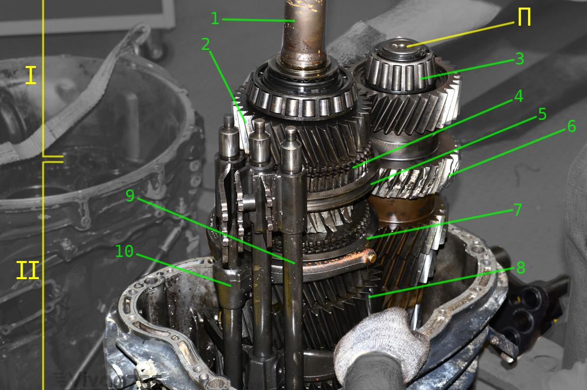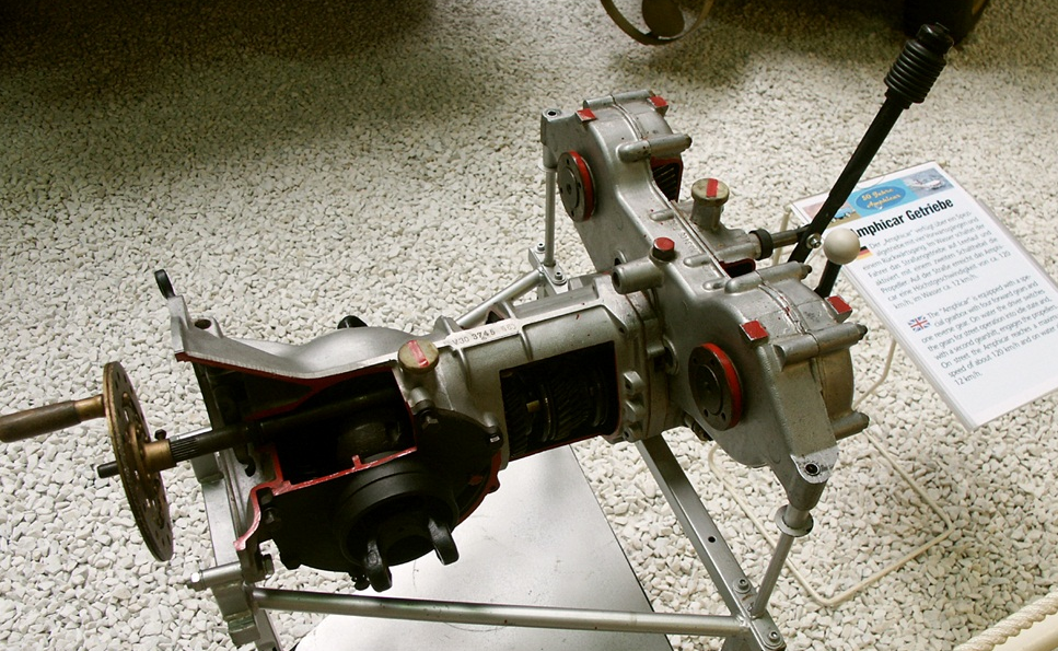 The main shaft extends outside the case in both directions: the input shaft towards the engine, and the output shaft towards the rear axle (on rear-wheel-drive cars. Front-wheel-drive vehicles generally have the engine and transmission mounted transversely, the differential being part of the transmission assembly.) The shaft is suspended by the main bearings, and is split towards the input end. At the point of the split, a pilot bearing holds the shafts together. The gears and clutches ride on the main shaft, the gears being free to turn relative to the mainshaft except when engaged by the clutches.