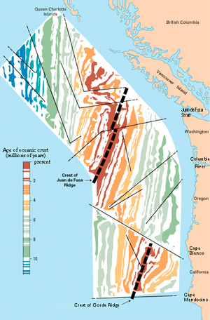 They were first noted in the 1970s on the Juan De Fuca ridge (spreading center) off northwestern North America where marine magnetic anomalies created during seafloor spreading show offsets not parallel to plate motion directions indicated by the trends of transform faults.[8] They were soon found in other locations including the Galapagos Spreading Center[5] and East Pacific Rise,[10] and are now known to be ubiquitous on fast and intermediate spreading rate ridges.[10]