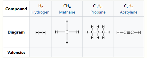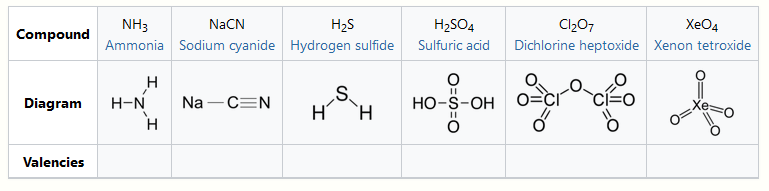The combining capacity, or affinity of an atom of a given element is determined by the number of hydrogen atoms that it combines with. In methane, carbon has a valence of 4; in ammonia, nitrogen has a valence of 3; in water, oxygen has a valence of 2; and in hydrogen chloride, chlorine has a valence of 1. Chlorine, as it has a valence of one, can be substituted for hydrogen. Phosphorus has a valence of 5 in phosphorus pentachloride, PCl5. Valence diagrams of a compound represent the connectivity of the elements, with lines drawn between two elements, sometimes called bonds, representing a saturated valency for each element.[1] The two tables below show some examples of different compounds, their valence diagrams, and the valences for each element of the compound.