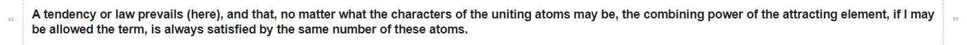 This “combining power” was afterwards called quantivalence or valency (and valence by American chemists).[6] In 1857 August Kekulé proposed fixed valences for many elements, such as 4 for carbon, and used them to propose structural formulas for many organic molecules, which are still accepted today.