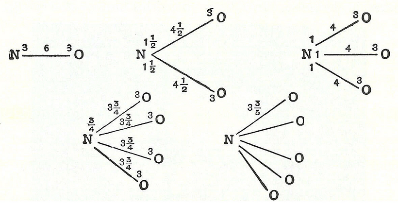 In 1789, William Higgins published views on what he called combinations of "ultimate" particles, which foreshadowed the concept of valency bonds.[6] If, for example, according to Higgins, the force between the ultimate particle of oxygen and the ultimate particle of nitrogen were 6, then the strength of the force would be divided accordingly, and likewise for the other combinations of ultimate particles (see illustration).