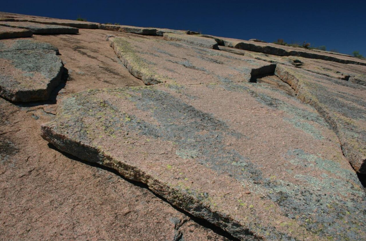 The prominent granite dome is visible for many miles in the surrounding basin of the Llano Uplift. The weathered dome, standing above the surrounding plain is known to geologists as a monadnock. The rock is actually the visible above-ground part of a segmented ridge, the surface expression of a large igneous batholith, called the Town Mountain Granite[1] of middle Precambrian (1,082 ± 6 million years ago)[2] material that intruded into earlier metamorphic schist, called the Packsaddle Schist.[1] The intrusive granite of the rock mass, or pluton, was exposed by extensive erosion of the surrounding sedimentary rock, primarily the Cretaceous Edwards limestone, which is exposed a few miles to the south of Enchanted Rock.[1]