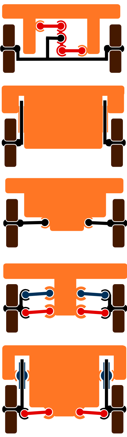 Dependent systems may be differentiated by the system of linkages used to locate them, both longitudinally and transversely. Often both functions are combined in a set of linkages.