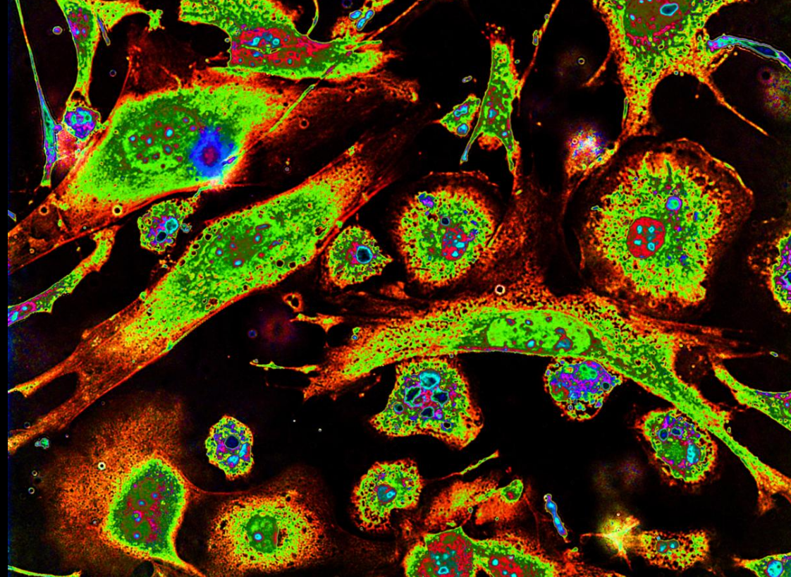 Epithelioid cells (polarized form, nucleus color - green) and macrophages (nucleus color – red) in peritoneal cell culture of mice, stimulated by inactivated Mycobacteria tuberculosis, on the 10th day of cultivation. The pseudo color image was obtained by color coding of different optical densities in a photo of cells, stained by Azure-Eosine. The shape of cells determined by their cytoskeleton, and the color characterizes the different their cytomorphology. https://handwiki.org/wiki/index.php?curid=1509929