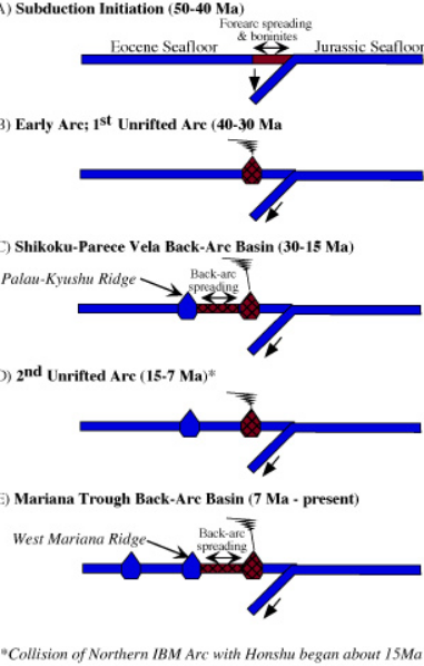 The evolution of the IBM arc system is among the best known of any convergent margin. Because IBM has always been an arc system under strong extension, its components encompass a broad area, from the Palau-Kyushu Ridge to the IBM trench (see first-right figure). In general, the oldest components are farthest west, but a complete record of evolution is preserved in the forearc. The IBM subduction zone began as part of a hemispheric-scale foundering of old, dense lithosphere in the Western Pacific (Stern Bloomer). The beginning of true subduction localized the magmatic arc close to its present position, about 200 km away from the trench, and allowed the sub-forearc mantle to stabilize and cool. The arc stabilized until about 30 Ma, when it began to rift to form the Parece Vela Basin. Spreading also began in the northernmost part of the IBM arc about 25 Ma and propagated south to form the Shikoku Basin. Parece Vela and Shikoku basin spreading systems met about 20 Ma and the combined Parece Vela Basin-Shikioku Basin continued widening until about 15 Ma, ultimately producing Earth's largest back-arc basin. The arc was disrupted during rifting but began to build again as a distinct magmatic system once seafloor spreading began. Arc volcanism, especially explosive volcanism, waned during much of this episode, with a resurgence beginning about 20 Ma in the south and about 17 Ma in the north. Tephra from northern and southern IBM show that strong compositional differences observed for the modern arc have existed over most of the arc's history, with northern IBM being more depleted and southern IBM being relatively enriched. About 15 Ma, the northernmost IBM began to collide with Honshū, probably as a result of new subduction along the Nankai Trough. A new episode of rifting to form the Mariana Trough back-arc basin began sometime after 10 Ma, with seafloor spreading beginning about 3–4 Ma. Because disruption of the arc is the first stage in forming any back-arc basin, the present Mariana arc volcanoes cannot be older than 3–4 Ma but the Izu-Bonin volcanoes could be as old as ~25 Ma. The Izu interarc rifts began to form about 2 Ma.