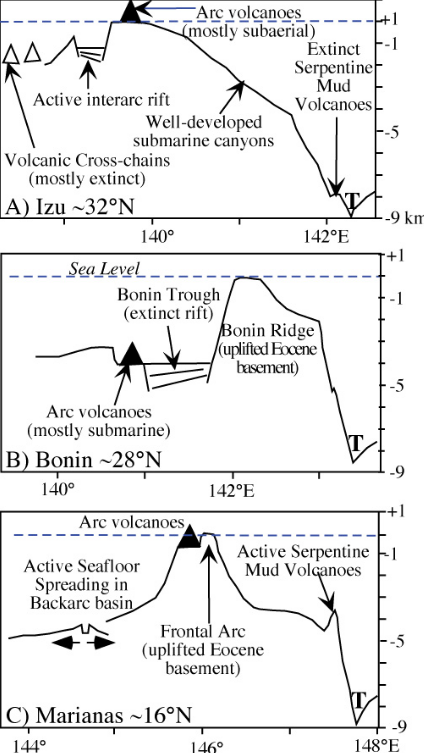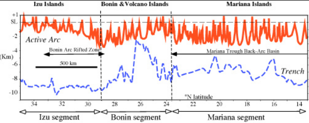 The back-arc regions of the three segments are quite different. The Izu segment is marked by several volcanic cross-chains which extend SW away from the magmatic front. The magmatically-starved Bonin arc segment has no back-arc basin, inter-arc rift, or rear-arc cross chains. The Mariana segment is characterized by an actively spreading back arc basin known as the Mariana Trough. The Mariana Trough shows marked variations along strike, with seafloor spreading south of 19°15’ and rifting farther north.