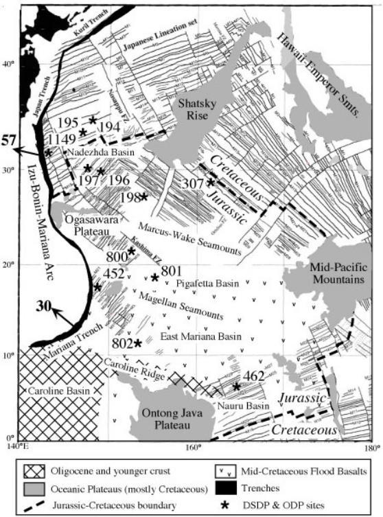 The age of Western Pacific seafloor has been interpreted from seafloor magnetic anomalies correlated to the geomagnetic reversal timescale Nakanishi, Tamaki & Kobayashi 1992 and confirmed by Ocean Drilling Program scientific drilling. Three major sets of magnetic anomalies have been identified in the area of interest. Each of these lineation sets comprises M-series (mid-Jurassic to mid-Cretaceous) magnetic anomalies that are essentially "growth rings" of the Pacific Plate. These anomaly sets indicate that the small, roughly triangular Pacific plate grew by spreading along three ridges (Bartolini Larson). The oldest identifiable lineations are M33 to M35 (Nakanishi 1993) or perhaps even M38 (Handschumacher Sager). It is difficult to say how old these lineations and the older crust might be; the oldest magnetic lineations for which ages have been assigned are M29 (157 Ma; (Channell Erba). Magnetic lineations as old as M29 are not known from other oceans, and the area in the Western Pacific that lies inside the M29 lineation – that is, crust older than M29 – is on the order of 3x106 km2, about a third of the size of the United States. ODP site 801 lies on seafloor that isconsiderably older than M29 and the MORB basement there yields Ar-Ar ages of 167±5 Ma (Pringle 1992). The oldest sediments at site 801C are middle Jurassic, Callovian or latest Bathonian (~162 Ma; Gradstein, Ogg & Smith 2005).