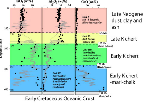 The figure above shows the typical sediments drilled at Ocean Drilling Program site 1149, east of the Izu-Bonin segment. The sediments drilled at ODP site 1149 are about 400 m thick and are as old as 134 million years. The sedimentary section is a typical pelagic stratigraphy, accumulated mostly in the Cretaceous but also in the last 7 million years (late Neogene) built on a basement of Early Cretaceous oceanic crust. The lowermost portion is carbonate and chert, the next layer is very chert-rich, the third layer is clay-rich. This is followed by a long depositional hiatus before sedimentation resumes ~6.5 Ma (Late Miocene), with deposition of volcanic ash, clay, and windblown dust. The stratigraphy east of the Mariana segment differs from that being subducted beneath the Izu-Bonin segment in having a much greater abundance of Early Cretaceous intra-plate volcanics and flood basalts. About 470m of oceanic crust was penetrated at ODP site 801C during Legs 129 and 185. These are typical mid-ocean ridge basalt that were affected by low-temperature hydrothermal alteration. This crust is overlain by a 3 m thick, bright yellow hydrothermal deposit and about 60 m of alkali olivine basalt, 157.4±0.5 Ma old (Pringle 1992).
