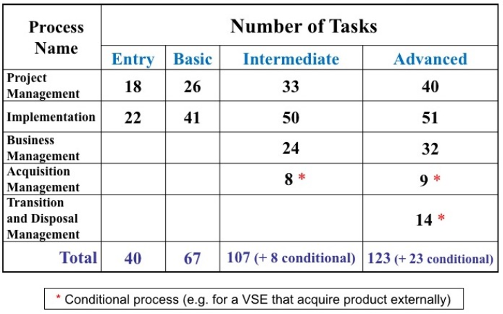 The software engineering Entry profile has the same 2 processes and activities. But the number of tasks and the number of documents is lower than the Basic profile. The table below lists the number of tasks for each process of the software generic profile group. A conditional process is a process that can be mandatory under some specific conditions, can be optional under specified conditions, and can be out of scope or not applicable under specified conditions. https://handwiki.org/wiki/index.php?curid=1915755