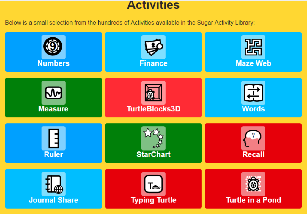 Hundreds of learning activities for Sugar can be downloaded from the Sugar Activity Library. Additional activities are available from third parties, such as the Project Ceibal portal in Uruguay.