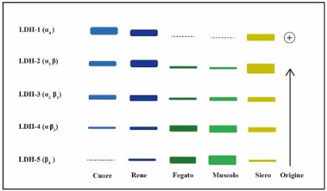 Ideally, for diagnostic purposes, it would be desirable to analyze specific enzymes that would allow to identify the tissue from which they come; but unfortunately it exist isoenzymes that have a different distribution and they are aspecific in various tissues. The most studied case is that of the dehydrogenase lactate. The enzyme consists of four subunits. There are two types of subunits that, combining in various ways, give rise to five different forms of lactate dehydrogenase ɑ1ß, ɑ2ß, ß3, ɑß4, and ß5. These five forms, separable electrophoretically, are differently distributed in tissues (figure 1). Today it is possible, in some cases, to distinguish the isoenzymes, make use of monoclonal antibodies. This method has been applied to recognize the different isoenzymes of human phospho fruttochinase, and to identify what was the absent form in the hereditary deficiencies of phosphofructokinase. The isoenzymatic representations, in addition to give us indications on the origin of the tissue, are also useful in legal medicine. Since numerous enzymes of the serum and of the red blood cells are present in different isoenzimatic forms, the particular distribution in a blood sample can help to identify its origin.