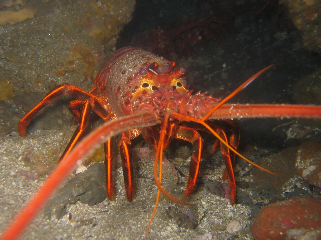After mating, the fertilized eggs of the California spiny lobster are carried on the female's pleopods until they hatch, with between 120,000 and 680,000 carried by a single female.[47] The eggs begin coral red, but darken as they develop to a deep maroon.[48] When she is carrying the eggs, the female is said to be "berried". The eggs are ready to hatch after 10 weeks,[47] and spawning takes place from May to August.[49] The larvae that hatch (called phyllosoma larvae) do not resemble the adults. Instead, they are flat, transparent animals around 14 mm (0.55 in) long, but as thin as a sheet of paper.[50] The larvae feed on plankton,[48] and grow through ten molts into ten further larval stages, the last of which is around 30–32 mm (1.2–1.3 in) long.[50] The full series of larval molts takes around 7 months, and when the last stage molts, it metamorphoses into the puerulus state, which is a juvenile form of the adult, though still transparent.[50] The puerulus larvae settle to the sea floor when the water is near its maximum temperature, which in Baja California is in the fall.[51]