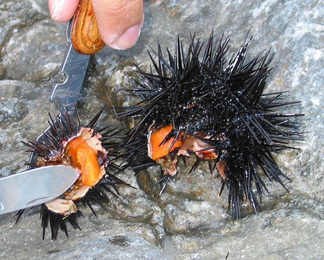Sea urchins are spiky echinoderms with spherical bodies which usually contain five gonads. They move slowly, feed mostly on seaweed, and are important for the diet of sea otters. Sea urchins are dioecious, having separate male and female sexes, although there is generally no easy way to distinguish the two. The gonads are lined with muscles underneath the peritoneum, and these allow the animal to squeeze its gametes through the duct and into the surrounding sea water, where fertilization takes place.[65] Their roe (male and female gonads) is soft and melting, with a colour ranging from orange to pale yellow, and is sought after as a human delicacy in many parts of the world.