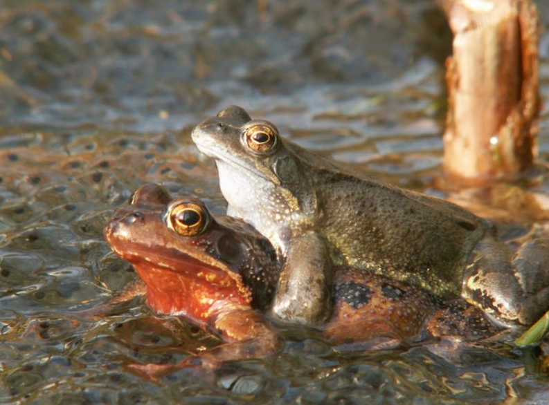 Female frogs and toads usually spawn gelatinous egg masses containing thousands of eggs in water. Different species lay eggs in distinctive and identifiable ways. For example, the American toad lays long strings of eggs. The eggs are highly vulnerable to predation, so frogs have evolved many techniques to ensure the survival of the next generation. In colder areas the embryo is black to absorb more heat from the sun, which speeds up development. Most commonly, this involves synchronous reproduction. Many individuals will breed at the same time, overwhelming the actions of predators; the majority of the offspring will still die due to predation, but there is a greater chance some will survive. Another way in which some species avoid predators and the pathogens eggs are exposed to in ponds is to lay eggs on leaves above the pond, with a gelatinous coating designed to retain moisture. In these species the tadpoles drop into the water upon hatching. The eggs of some species laid out of water can detect vibrations of nearby predatory wasps or snakes, and will hatch early to avoid being eaten.[69]
