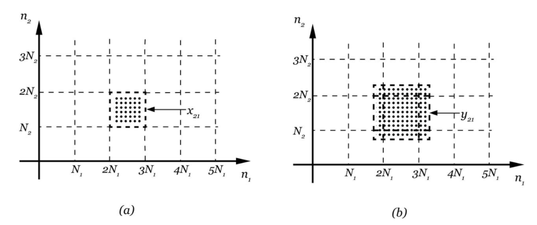 [math]\displaystyle{ x_{k_1k_2}\left(n_1,n_2\right) = x\left(n_1, n_2\right) \text{if } k_1N_1 \le n_1 \lt (k_1 +1)N_1 \text{and } k_2N_2 \le n_2 \lt (k_2 +1)N_2 }[/math]