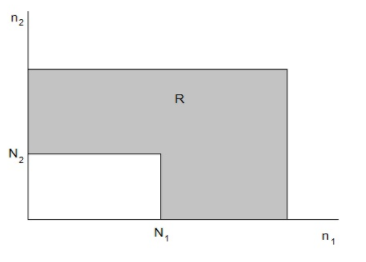 Now, taking the double summation for the region "R" i.e. for [math]\displaystyle{ n_1 \ge N_1-1 }[/math] and [math]\displaystyle{ n_2 \ge N_2-1 }[/math] and ... [math]\displaystyle{ n_m \ge N_m-1 }[/math] shown in figure (shown for 2-D case), the coefficients [math]\displaystyle{ b\left(n_1,n_2,...,n_m\right) }[/math] are obtained.