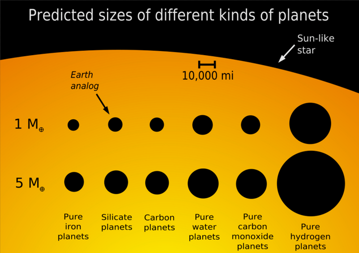 Cold planets have a maximum radius because adding more mass at that point causes the planet to compress under the weight instead of increasing the radius. The maximum radius for solid planets is lower than the maximum radius for gas planets.[73]