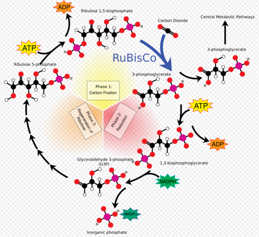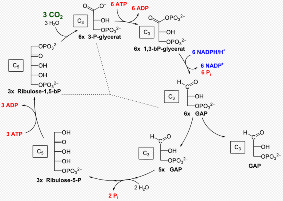 Thus, of six G3P produced, five are used to make three RuBP (5C) molecules (totaling 15 carbons), with only one G3P available for subsequent conversion to hexose. This requires nine ATP molecules and six NADPH molecules per three CO2 molecules. The equation of the overall Calvin cycle is shown diagrammatically below.