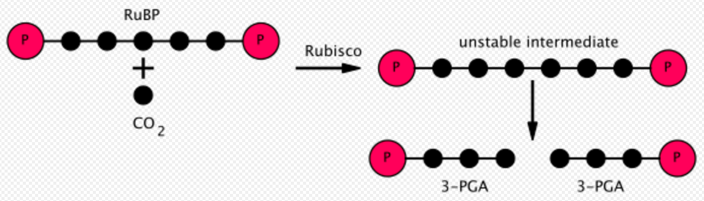 RuBisCO also reacts competitively with O2 instead of CO2 in photorespiration. The rate of photorespiration is higher at high temperatures. Photorespiration turns RuBP into 3-PGA and 2-phosphoglycolate, a 2-carbon molecule that can be converted via glycolate and glyoxalate to glycine. Via the glycine cleavage system and tetrahydrofolate, two glycines are converted into serine +CO2. Serine can be converted back to 3-phosphoglycerate. Thus, only 3 of 4 carbons from two phosphoglycolates can be converted back to 3-PGA. It can be seen that photorespiration has very negative consequences for the plant, because, rather than fixing CO2, this process leads to loss of CO2. C4 carbon fixation evolved to circumvent photorespiration, but can occur only in certain plants native to very warm or tropical climates—corn, for example.
