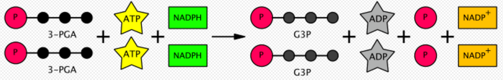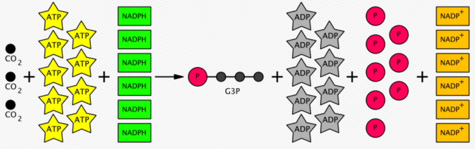 2 molecule is incorporated into one of two three-carbon molecules (glyceraldehyde 3-phosphate or G3P), where it uses up two molecules of ATP and two molecules of NADPH, which had been produced in the light-dependent stage. The three steps involved are:
