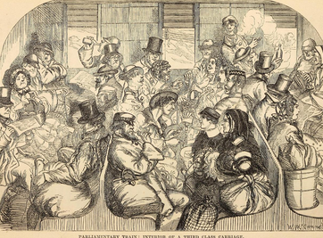 In the earliest days of passenger railways in the United Kingdom the poor were encouraged to travel in order to find employment in the growing industrial centres, but trains were generally unaffordable to them except in the most basic of open wagons, in many cases attached to goods trains.[1] Political pressure caused the Board of Trade to investigate, and Sir Robert Peel's Conservative government enacted the Railway Regulation Act 1844, which took effect on 1 November 1844. It compelled "the provision of at least one train a day each way at a speed of not less than 12 miles an hour including stops, which were to be made at all stations, and of carriages protected from the weather and provided with seats; for all which luxuries not more than a penny a mile might be charged".[2]