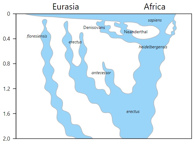 Fossil evidence suggests that humans' earliest hominid ancestors may have split from other primates as early as the late Oligocene, circa 26 to 24 Ma, and that by the early Miocene, the adaptive radiation of many different hominoid forms was well underway.[123] Evidence from the molecular dating of genetic differences indicates that the gibbon lineage (family Hylobatidae) diverged between 18 and 12 Ma, and the orangutan lineage (subfamily Ponginae) diverged about 12 Ma. While there is no fossil evidence thus far clearly documenting the early ancestry of gibbons, fossil proto-orangutans may be represented by Sivapithecus from India and Griphopithecus from Turkey, dated to around 10 Ma. Molecular evidence further suggests that between 8 and 4 Ma, first the gorillas, and then the chimpanzee (genus Pan) split from the line leading to the humans.[124] We have no fossil record of this divergence, but distinctively hominid fossils have been found dating to 3.2 Ma (see Lucy) and possibly even earlier, at 6 or 7 Ma (see Toumaï).[125] Comparisons of DNA show that 99.4 percent of the coding regions are identical in chimpanzees and humans (95–96% overall[126][127]), which is taken as strong evidence of recent common ancestry.[128] Today, only one distinct human species survives, but many earlier species have been found in the fossil record, including Homo erectus, Homo habilis, and Homo neanderthalensis.