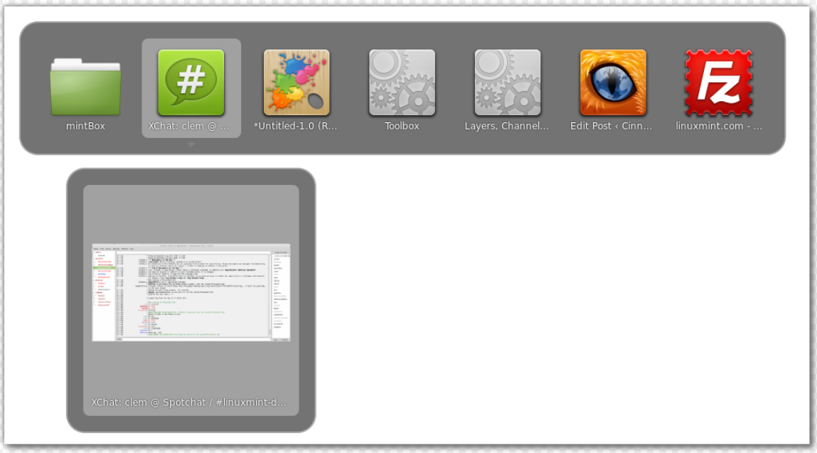 Cinnamon 1.6 showing a Alt-Tab thumbnails and window previews.
