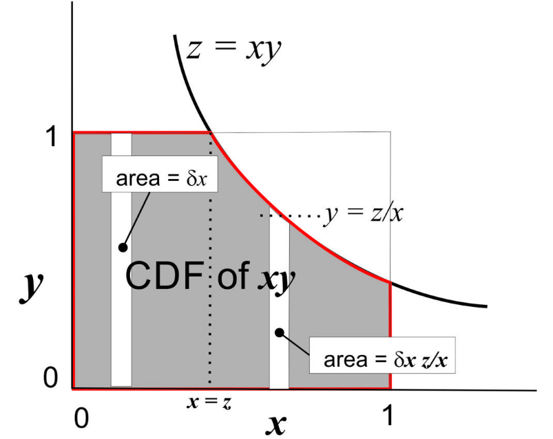 The figure illustrates the nature of the integrals above. The shaded area within the unit square and below the line z = xy, represents the CDF of z. This divides into two parts. The first is for 0 < x < z where the increment of area in the vertical slot is just equal to dx. The second part lies below the xy line, has y-height z/x, and incremental area dx z/x.