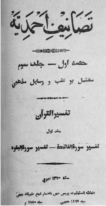 In 1869 he wrote Al-Khutbat al-Ahmadiya fi'l Arab wa'I Sirat al-Muhammadiya (A Series of Essays on the Life of Muhammad and Subjects Subsidiary Therein) as a rejoinder to William Muir’s widely known four-part book, The Life of Mahomet published in 1864.[92] He was deeply distress by Muir’s portrayal of Islam and the character of Mohammad. He was concerned that the book might create doubts among the younger generation of Muslims.[93] In order to prepare for the book he accompanied his son to England as he wanted to get a first-hand impression of Western civilisation.[94]